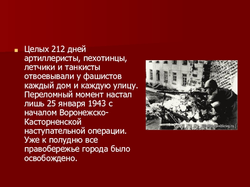каждый дом и каждую улицу. Переломный момент настал лишь 25 января 1943 с началом Воронежско-Касторненской наступательной операции. Уже к полудню все правобережье города было освобождено.