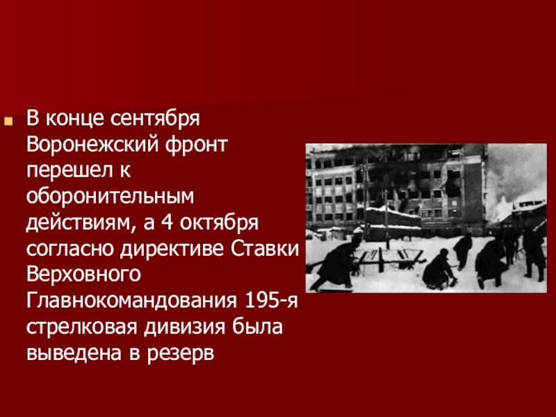 октября согласно директиве Ставки Верховного Главнокомандования 195-я стрелковая дивизия была выведена в резерв