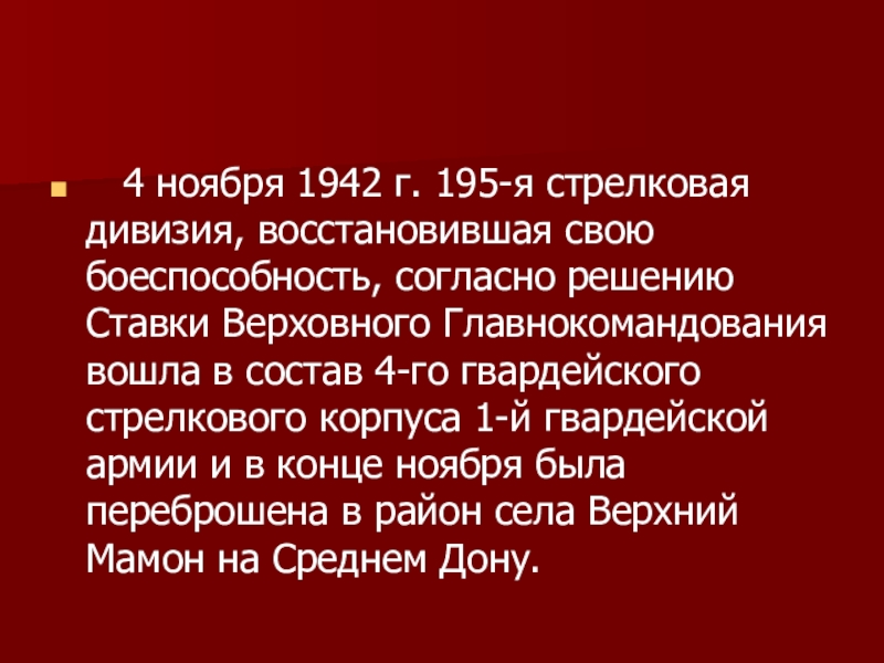 4 ноября 1942 г. 195-я стрелковая дивизия, восстановившая свою боеспособность,