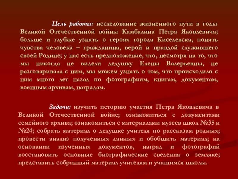 Задачи: изучить историю участия Петра Яковлевича в Великой Отечественной войне; ознакомиться с документами семейного архива; ознакомиться с материалами музеев школ №35 и №24; собрать материал о дедушке учителя по рассказам родных; провести анализ полученных данных и обобщить материал; на основании изученных документов, наград и фотографий восстановить основные биографические сведения о земляке; представить собранный материал учителям и учащимся школы.