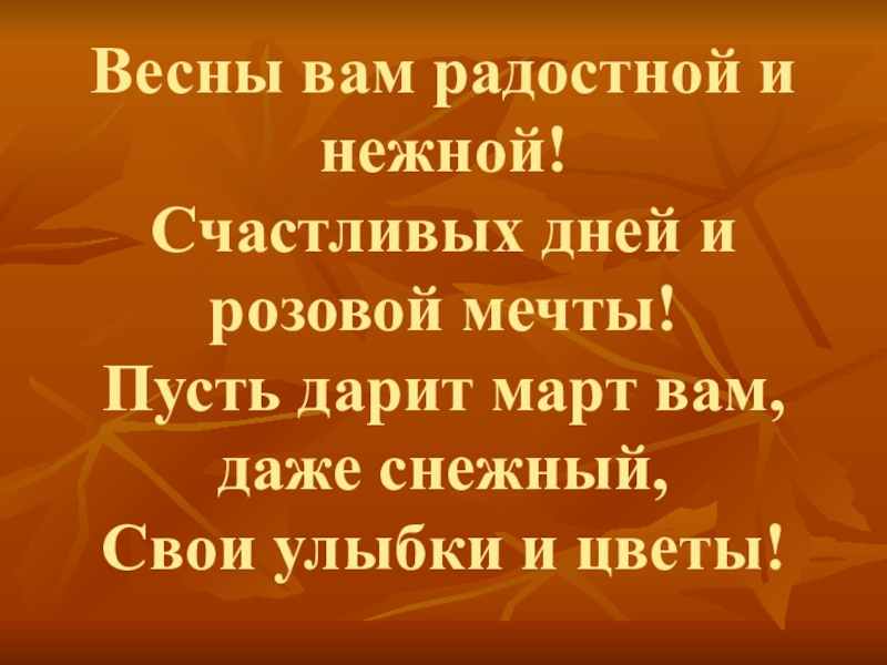 Слайд 14Весны вам радостной и нежной! Счастливых дней и розовой мечты! Пусть дарит март