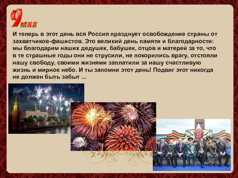 захватчиков-фашистов. Это великий день памяти и благодарности: мы благодарим наших дедушек, бабушек, отцов и матерей за то, что в те страшные годы они не струсили, не покорились врагу, отстояли нашу свободу, своими жизнями заплатили за нашу счастливую жизнь и мирное небо. И ты запомни этот день! Подвиг этот никогда не должен быть забыт ...