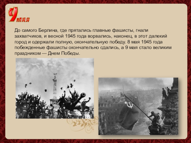 1945 года ворвались, наконец, в этот далекий город и одержали полную, окончательную победу. 8 мая 1945 года побежденные фашисты окончательно сдались, а 9 мая стало великим праздником — Днем Победы.