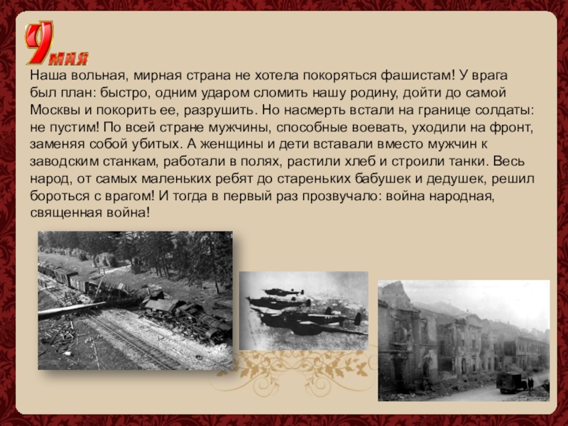 план: быстро, одним ударом сломить нашу родину, дойти до самой Москвы и покорить ее, разрушить. Но насмерть встали на границе солдаты: не пустим! По всей стране мужчины, способные воевать, уходили на фронт, заменяя собой убитых. А женщины и дети вставали вместо мужчин к заводским станкам, работали в полях, растили хлеб и строили танки. Весь народ, от самых маленьких ребят до стареньких бабушек и дедушек, решил бороться с врагом! И тогда в первый раз прозвучало: война народная, священная война!