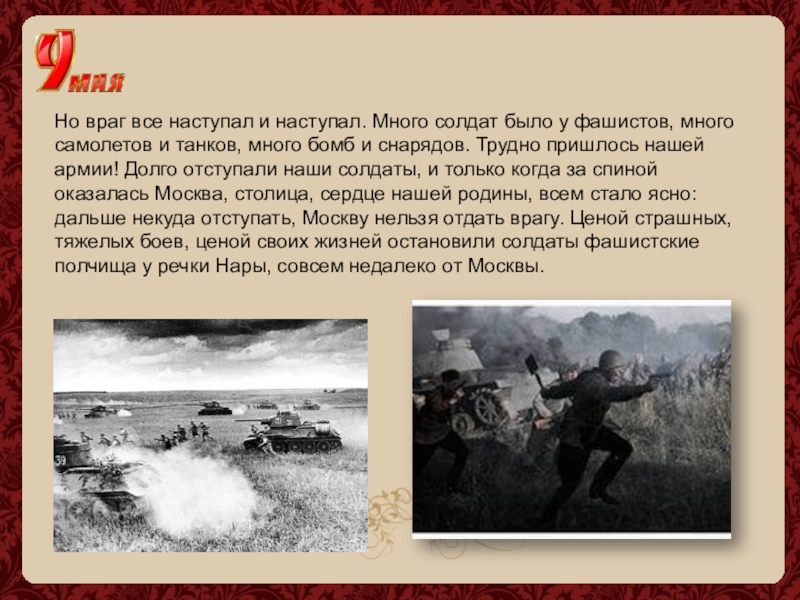 много самолетов и танков, много бомб и снарядов. Трудно пришлось нашей армии! Долго отступали наши солдаты, и только когда за спиной оказалась Москва, столица, сердце нашей родины, всем стало ясно: дальше некуда отступать, Москву нельзя отдать врагу. Ценой страшных, тяжелых боев, ценой своих жизней остановили солдаты фашистские полчища у речки Нары, совсем недалеко от Москвы.