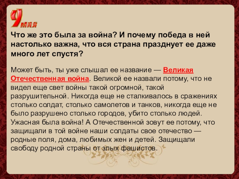 Может быть, ты уже слышал ее название — Великая Отечественная война. Великой ее назвали потому, что не видел еще свет войны такой огромной, такой разрушительной. Никогда еще не сталкивалось в сражениях столько солдат, столько самолетов и танков, никогда еще не было разрушено столько городов, убито столько людей. Ужасная была война! А Отечественной зовут ее потому, что защищали в той войне наши солдаты свое отечество — родные поля, дома, любимых жен и детей. Защищали свободу родной страны от злых фашистов.