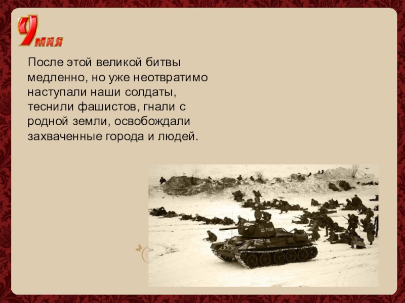 Слайд 9После этой великой битвы медленно, но уже неотвратимо наступали наши солдаты,