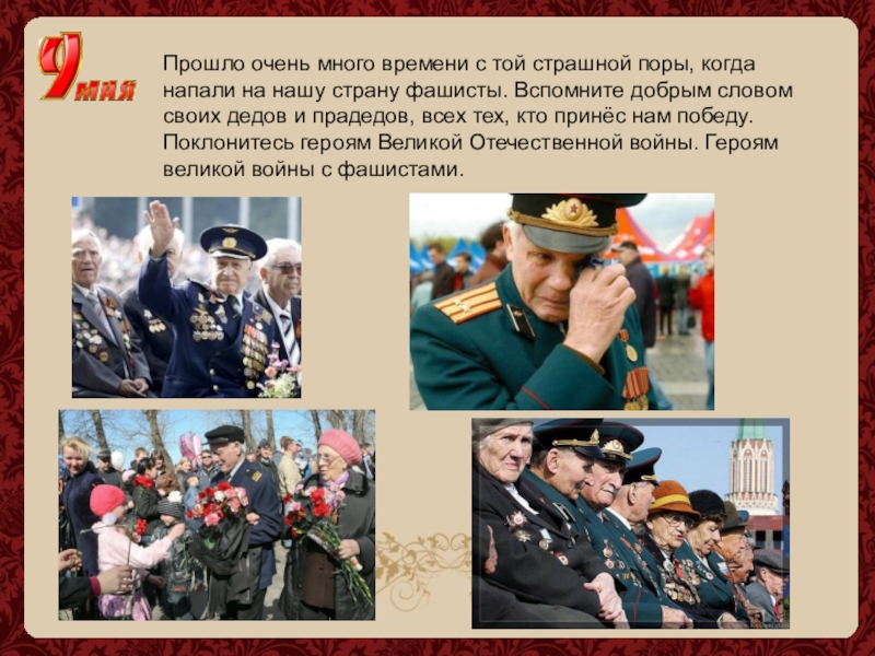 нашу страну фашисты. Вспомните добрым словом своих дедов и прадедов, всех тех, кто принёс нам победу. Поклонитесь героям Великой Отечественной войны. Героям великой войны с фашистами.