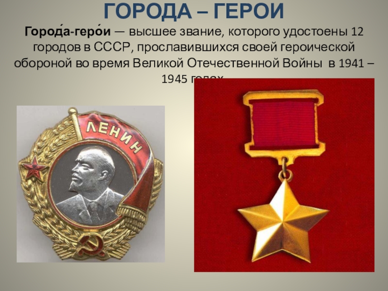 ГОРОДА – ГЕРОИ Город́а-геро́и — высшее звание, которого удостоены 12 городов в СССР, прославившихся своей героической обороной во время Великой Отечественной Войны в 1941 – 1945 годах.