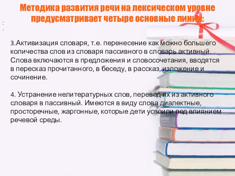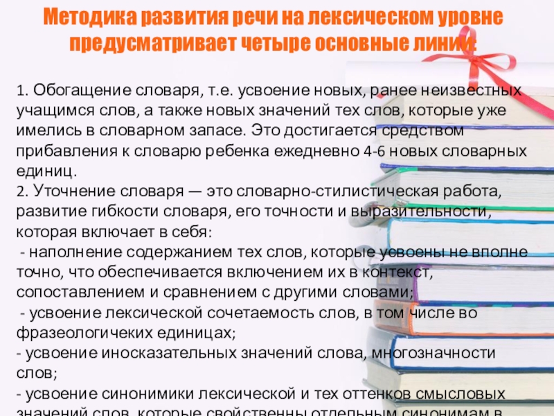 Методика развития речи на лексическом уровне предусматривает четыре основные линии: