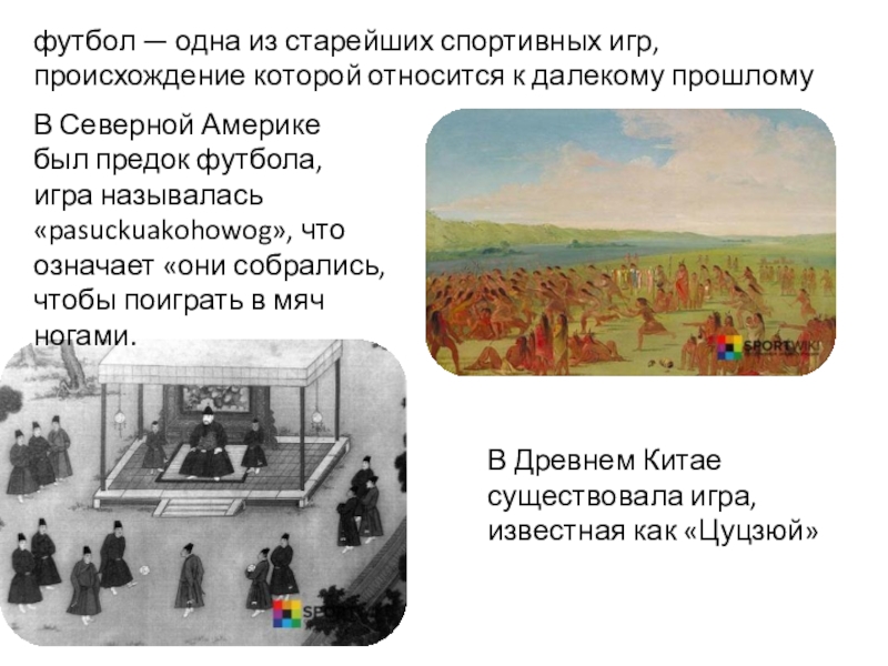 В Северной Америке был предок футбола, игра называлась «pasuckuakohowog», что означает «они собрались, чтобы поиграть в мяч ногами.