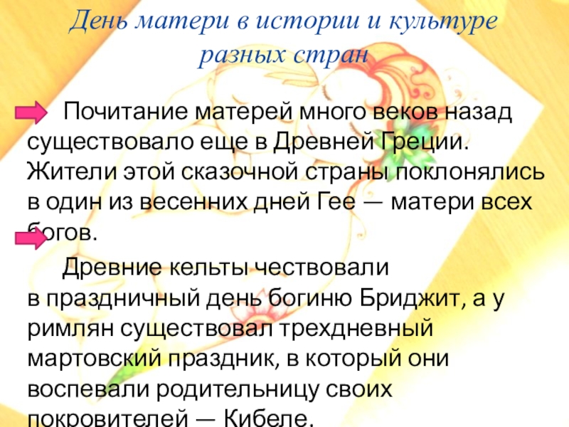 еще в Древней Греции. Жители этой сказочной страны поклонялись в один из весенних дней Гее — матери всех богов.