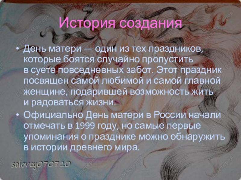 повседневных забот. Этот праздник посвящен самой любимой и самой главной женщине, подарившей возможность жить и радоваться жизни.
