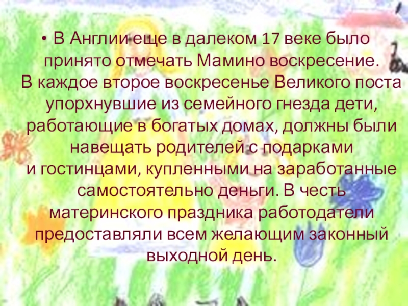 В Англии еще в далеком 17 веке было принято отмечать Мамино воскресение. В каждое
