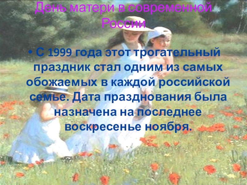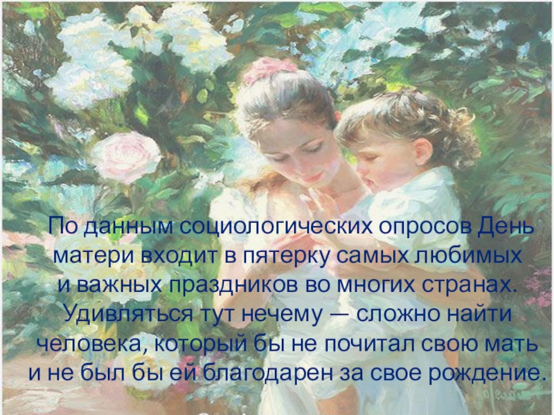 Слайд 9 По данным социологических опросов День матери входит в пятерку самых любимых и важных