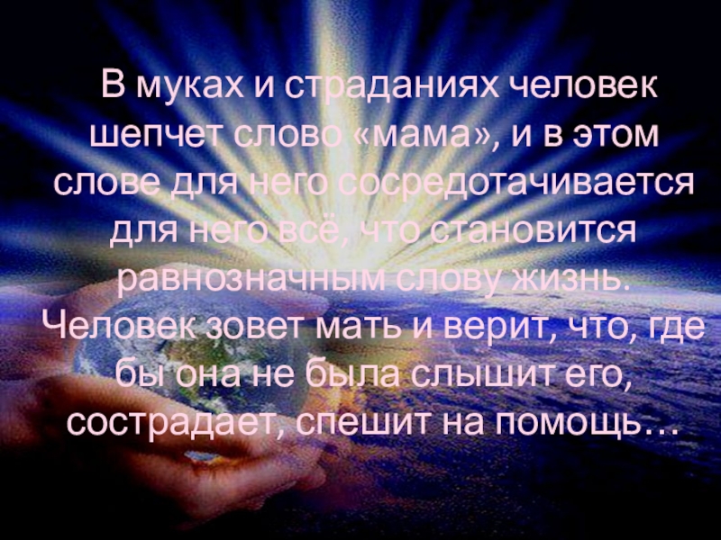 слове для него сосредотачивается для него всё, что становится равнозначным слову жизнь. Человек зовет мать и верит, что, где бы она не была слышит его, сострадает, спешит на помощь…