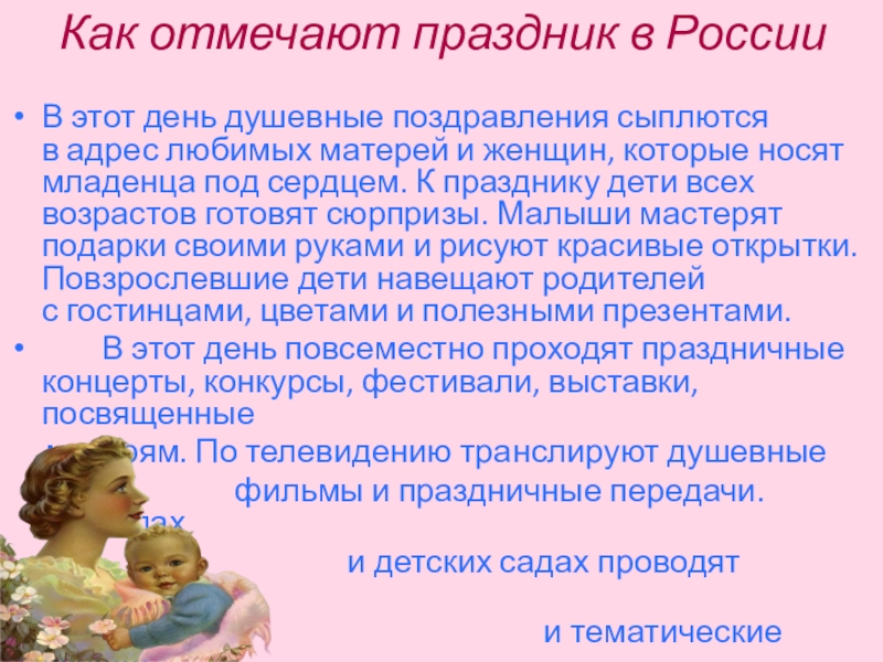 матерей и женщин, которые носят младенца под сердцем. К празднику дети всех возрастов готовят сюрпризы. Малыши мастерят подарки своими руками и рисуют красивые открытки. Повзрослевшие дети навещают родителей с гостинцами, цветами и полезными презентами.