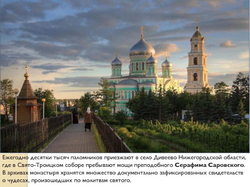 Слайд 2Ежегодно десятки тысяч паломников приезжают в село Дивеево Нижегородской области, где