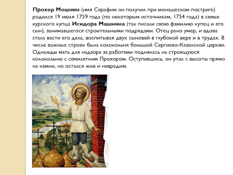 Слайд 3Прохор Мошнин (имя Серафим он получил при монашеском постриге) родился 19 июля