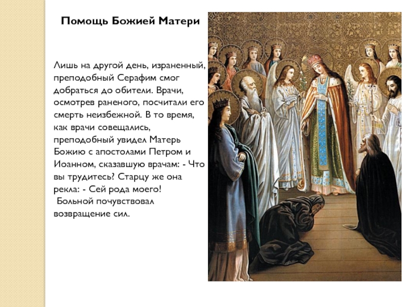 Слайд 10Лишь на другой день, израненный, преподобный Серафим смог добраться до обители.