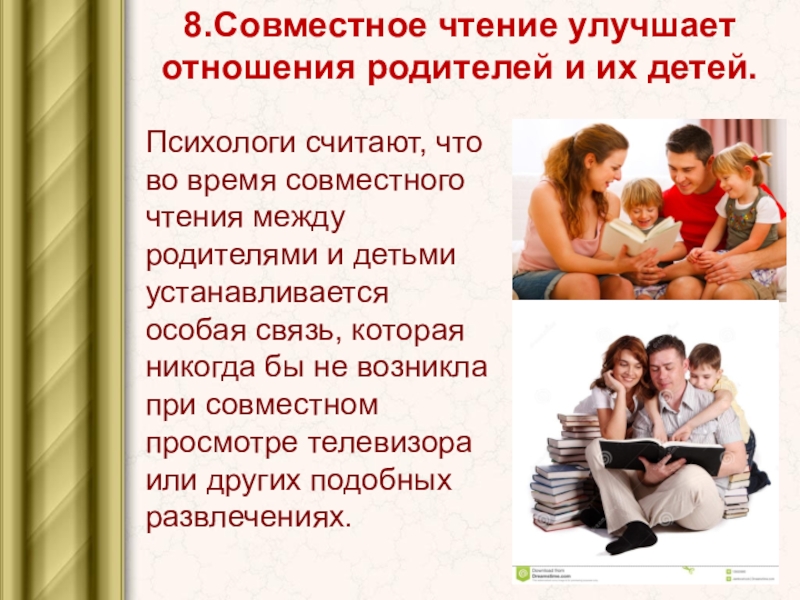 Слайд 128.Совместное чтение улучшает отношения родителей и их детей.