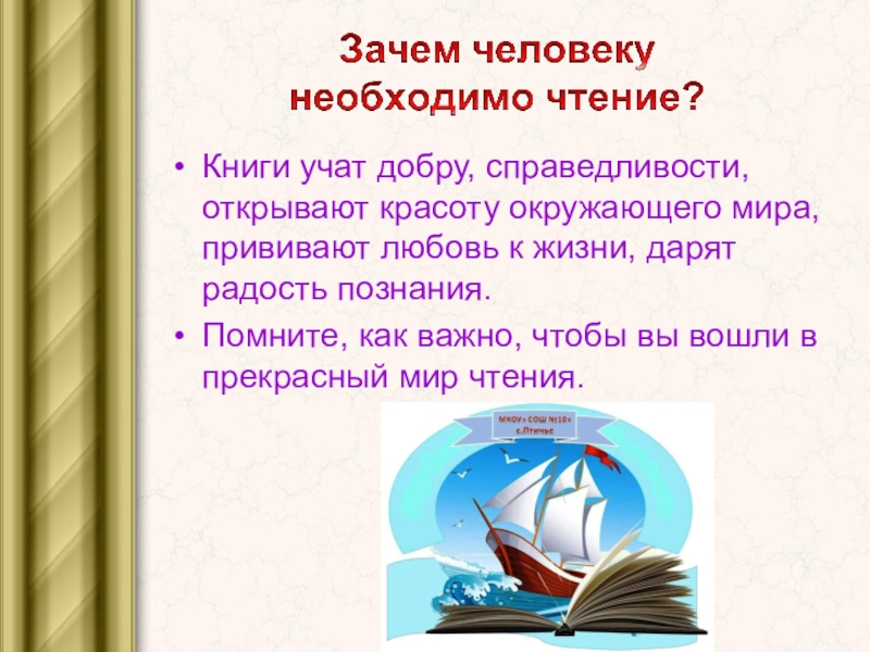 Слайд 17Книги учат добру, справедливости, открывают красоту окружающего мира, прививают любовь к