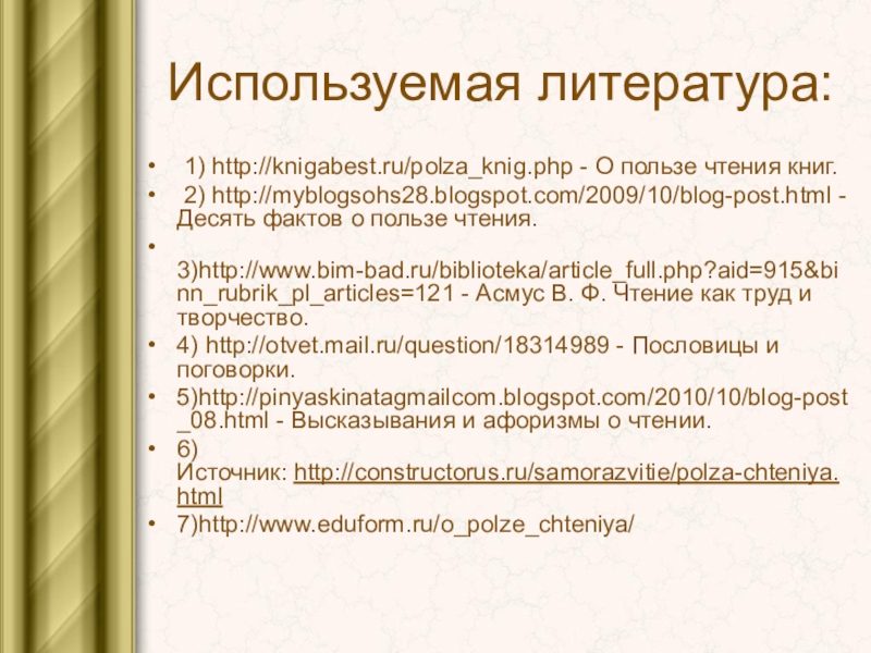 5)http://pinyaskinatagmailcom.blogspot.com/2010/10/blog-post_08.html - Высказывания и афоризмы о чтении.