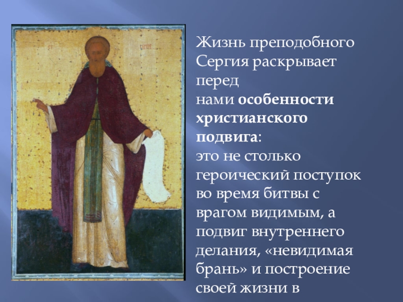 Слайд 16Жизнь преподобного Сергия раскрывает перед нами особенности христианского подвига: