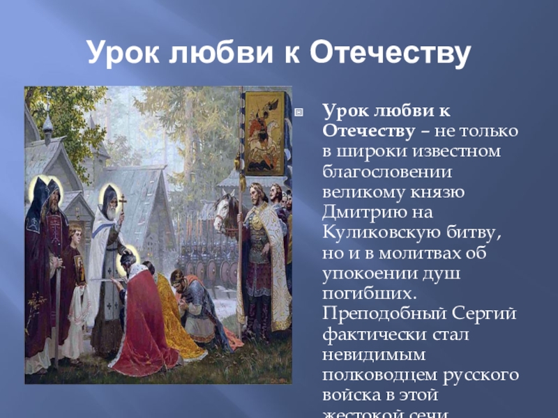 известном благословении великому князю Дмитрию на Куликовскую битву, но и в молитвах об упокоении душ погибших. Преподобный Сергий фактически стал невидимым полководцем русского войска в этой жестокой сечи.