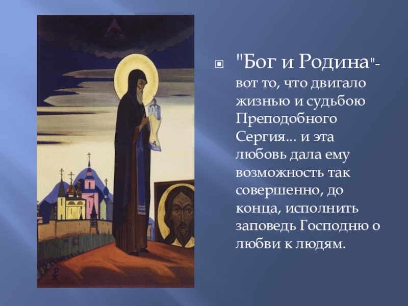 Слайд 15"Бог и Родина"-вот то, что двигало жизнью и судьбою Преподобного Сергия...