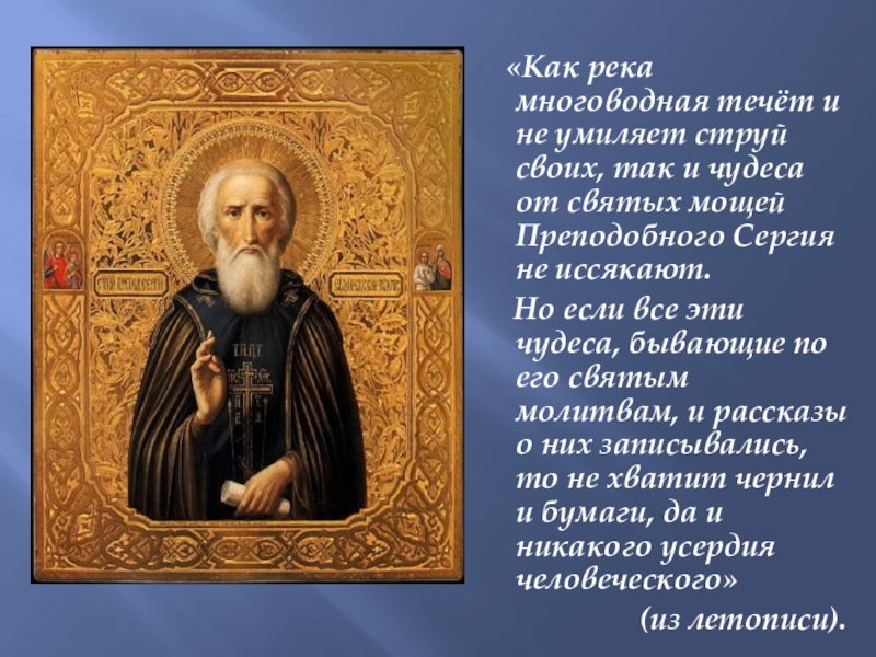 своих, так и чудеса от святых мощей Преподобного Сергия не иссякают.