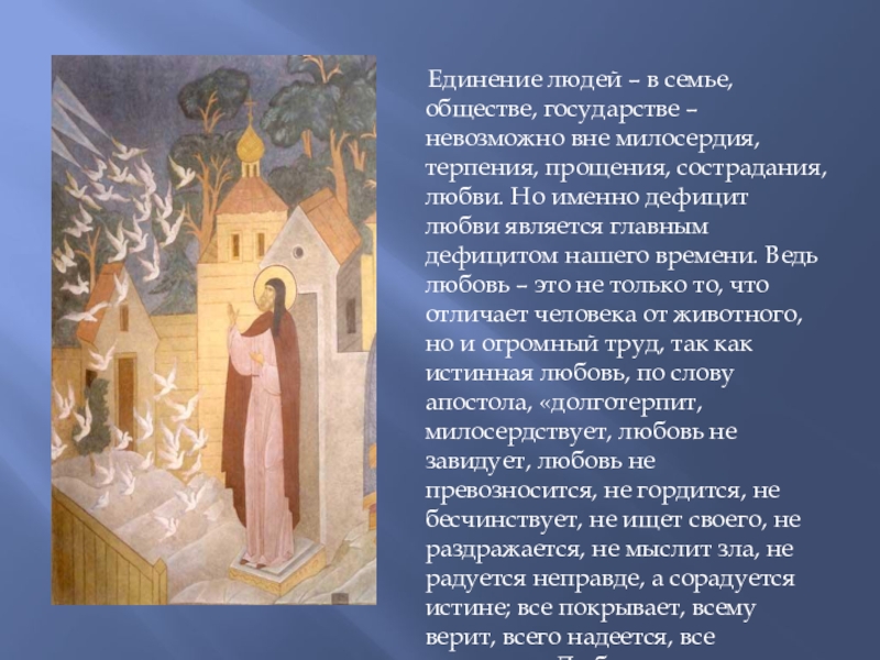 – невозможно вне милосердия, терпения, прощения, сострадания, любви. Но именно дефицит любви является главным дефицитом нашего времени. Ведь любовь – это не только то, что отличает человека от животного, но и огромный труд, так как истинная любовь, по слову апостола, «долготерпит, милосердствует, любовь не завидует, любовь не превозносится, не гордится, не бесчинствует, не ищет своего, не раздражается, не мыслит зла, не радуется неправде, а сорадуется истине; все покрывает, всему верит, всего надеется, все переносит. Любовь никогда не перестает»