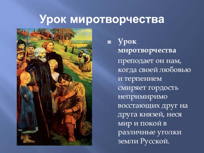 и терпением смиряет гордость непримиримо восстающих друг на друга князей, неся мир и покой в различные уголки земли Русской.
