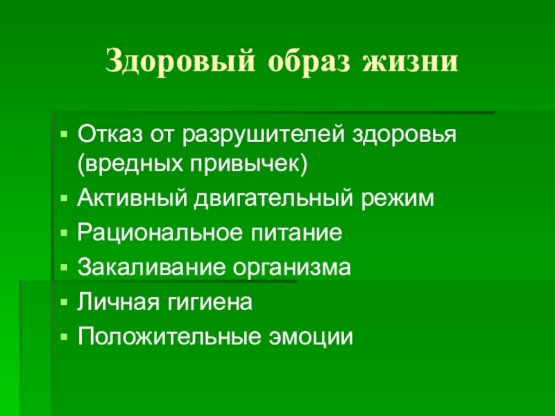 Здоровый образ жизниОтказ от разрушителей здоровья (вредных привычек)Активный двигательный режимРациональное питаниеЗакаливание организмаЛичная гигиенаПоложительные эмоции