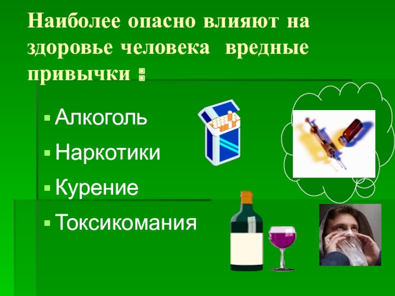 Слайд 7Наиболее опасно влияют на здоровье человека вредные привычки :