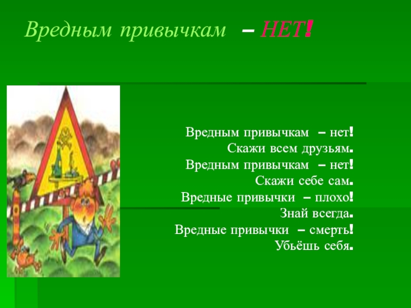 Вредным привычкам – НЕТ! Вредным привычкам – нет! Скажи всем друзьям.Вредным привычкам – нет! Скажи себе сам.Вредные