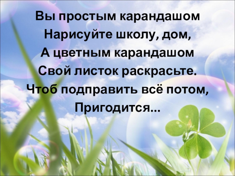 Вы простым карандашомНарисуйте школу, дом,А цветным карандашомСвой листок раскрасьте.Чтоб подправить всё потом,Пригодится...