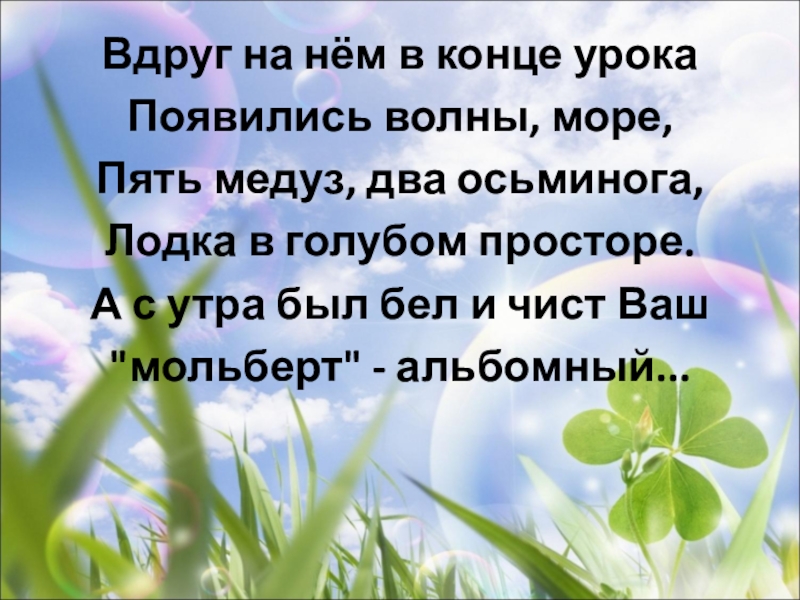 Вдруг на нём в конце урокаПоявились волны, море,Пять медуз, два осьминога,Лодка в голубом просторе.А с утра был