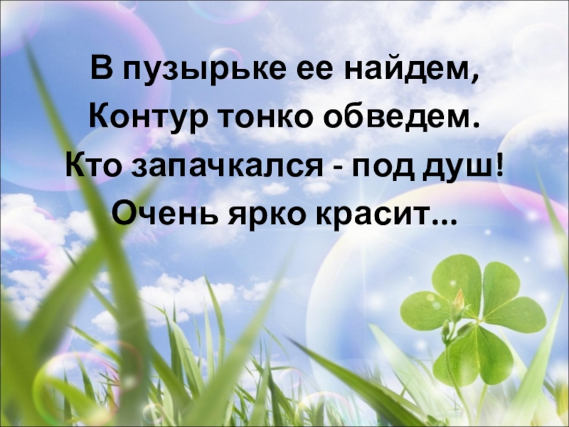 В пузырьке ее найдем,Контур тонко обведем.Кто запачкался - под душ!Очень ярко красит...