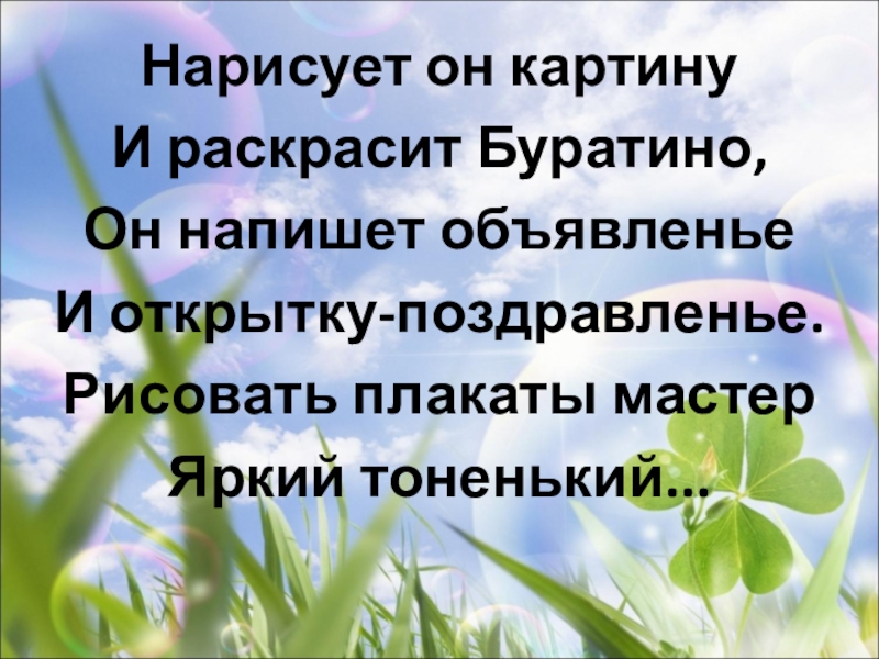 Нарисует он картинуИ раскрасит Буратино,Он напишет объявленьеИ открытку-поздравленье.Рисовать плакаты мастерЯркий тоненький...