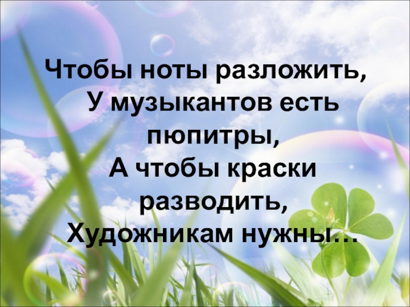 Чтобы ноты разложить, У музыкантов есть пюпитры, А чтобы краски разводить, Художникам нужны…