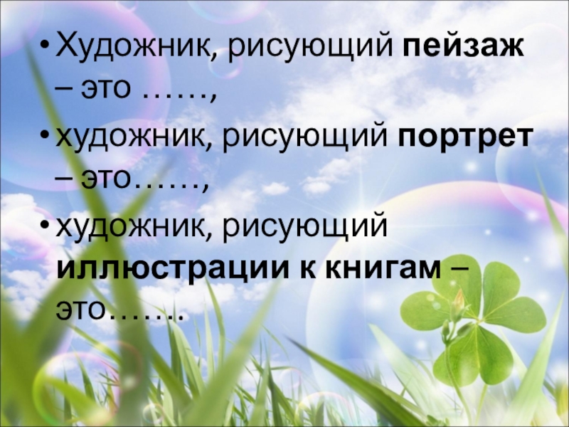 Художник, рисующий пейзаж – это ……, художник, рисующий портрет – это……, художник, рисующий иллюстрации к книгам –