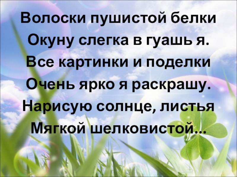 Волоски пушистой белкиОкуну слегка в гуашь я.Все картинки и поделкиОчень ярко я раскрашу.Нарисую солнце, листьяМягкой шелковистой...