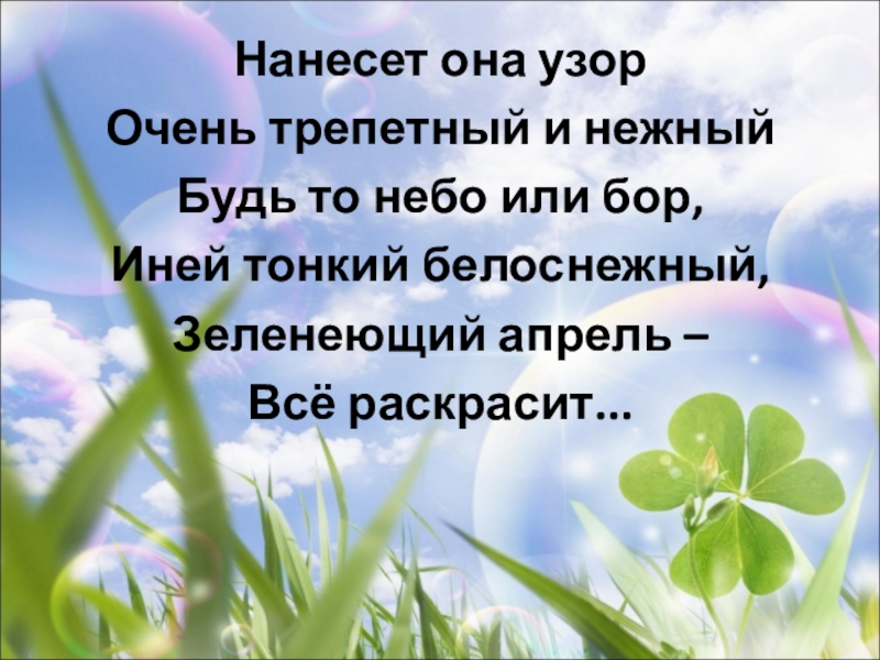 Нанесет она узорОчень трепетный и нежныйБудь то небо или бор,Иней тонкий белоснежный,Зеленеющий апрель –Всё раскрасит...