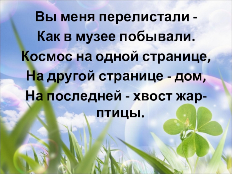 Вы меня перелистали -Как в музее побывали.Космос на одной странице,На другой странице - дом,На последней - хвост