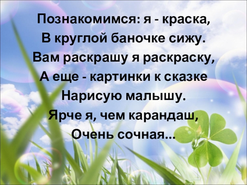 Познакомимся: я - краска,В круглой баночке сижу.Вам раскрашу я раскраску,А еще - картинки к сказкеНарисую малышу.Ярче я,