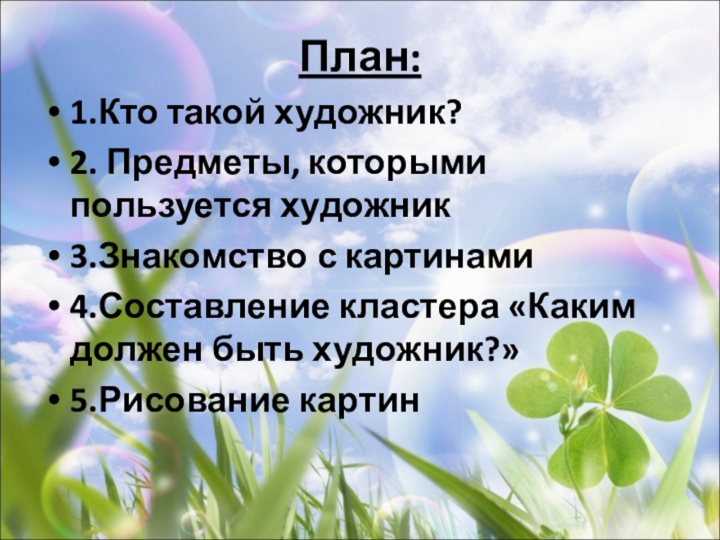План:1.Кто такой художник?2. Предметы, которыми пользуется художник3.Знакомство с картинами4.Составление кластера «Каким должен быть художник?»5.Рисование картин