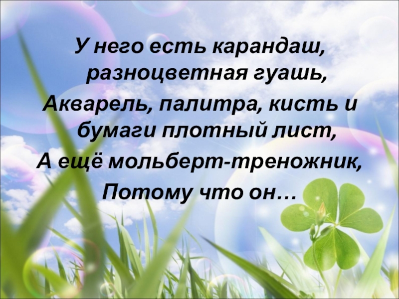 У него есть карандаш, разноцветная гуашь,Акварель, палитра, кисть и бумаги плотный лист,А ещё мольберт-треножник,Потому что он…
