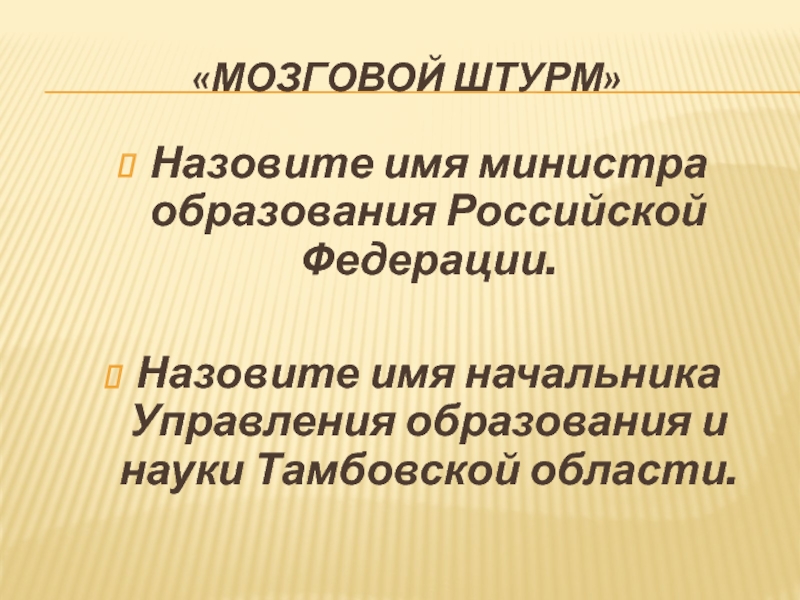 «Мозговой штурм»Назовите имя министра образования Российской Федерации.Назовите имя начальника Управления образования и науки Тамбовской области.