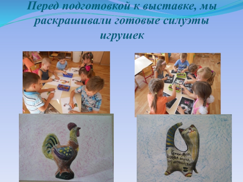 Слайд 24Перед подготовкой к выставке, мы раскрашивали готовые силуэты игрушек